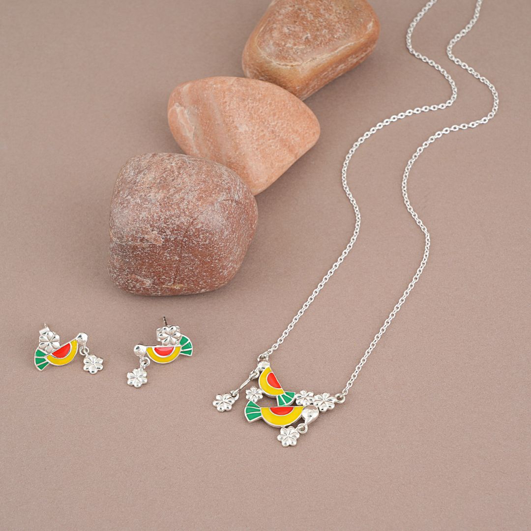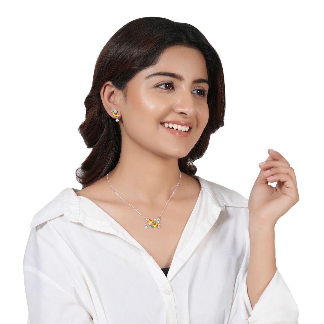 Enhance your style with this exquisite 92.5 Sterling Silver Bird Necklace Earrings Set. Crafted with precision and attention to detail, this set is not only a stunning addition to your jewellery collection but also a unique gift for your loved ones. The intricate design featuring colorful and vibrant birds makes this set a standout piece that is sure to make your special someone feel truly cherished.