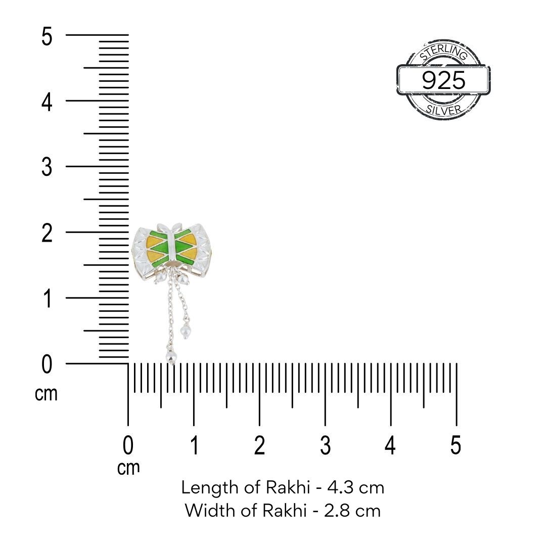Presenting the Damru 925 Silver Rakhi with green and yellow enamel – a beautiful way to show your brother how much you care! Our exquisite collection of 925 silver rakhis can be worn as meaningful pendants, so that you can cherish your special bond forever. The damru motif is intricately crafted in sterling silver with green & yellow for an elegant look. Each rakhi will come packaged in a beautiful gift box along with roli and chawal, making it perfect for gifting on any occasion. Show your brother just how much he means to you by ordering one today!