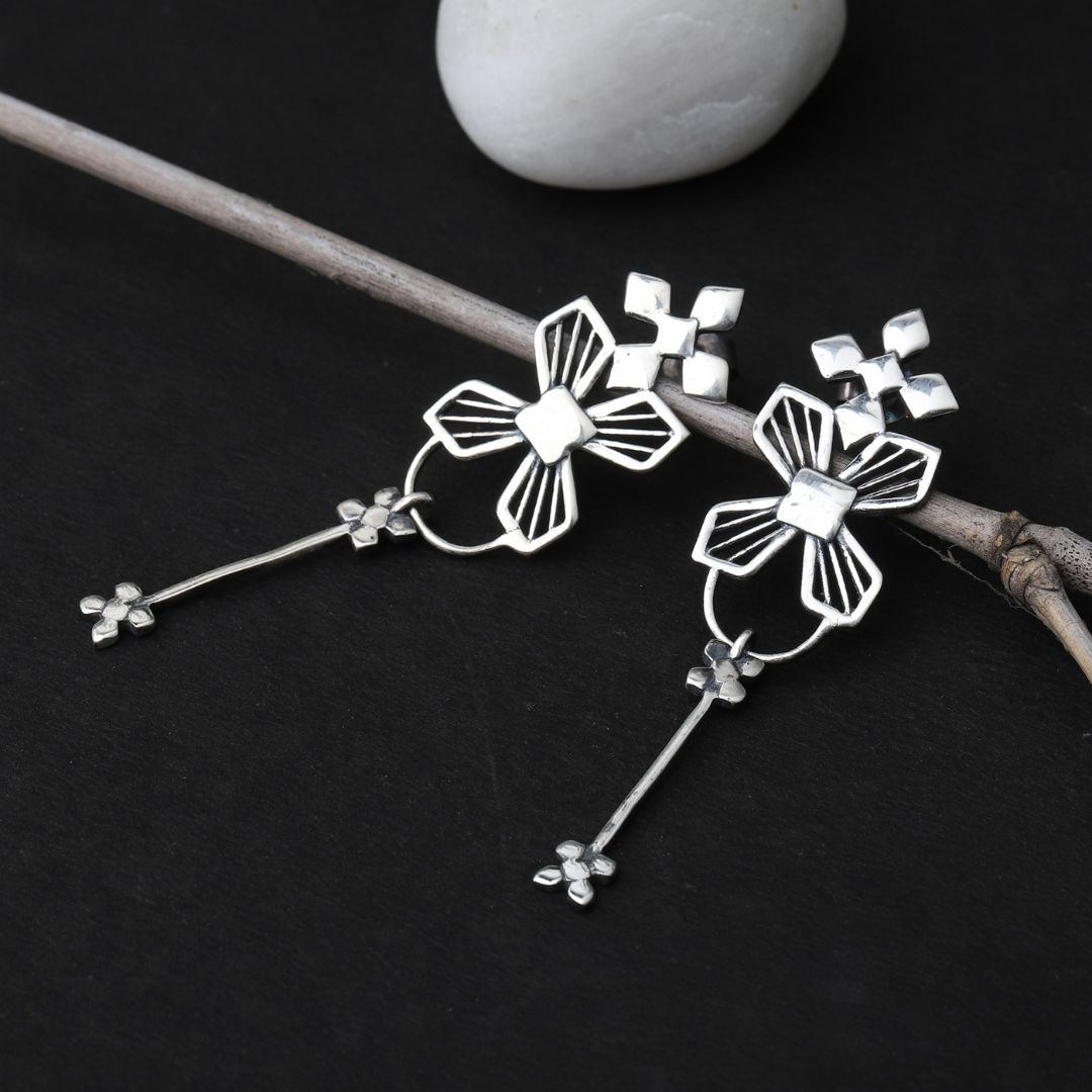Beautifully handcrafted, these 92.5 sterling silver geometrical flower design dangle earrings are the epitome of timeless beauty and modern sophistication. The intricate floral motif, combined with geometric elements, creates a stunning visual appeal that effortlessly complements any outfit, from casual daytime looks to glamorous evening ensembles.
