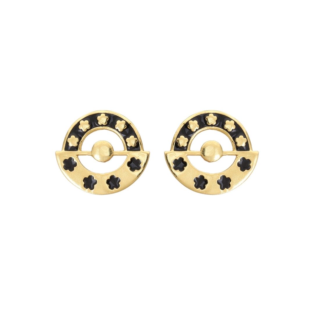 Gold Plated Black Round Floral 925 Silver Ear Studs
