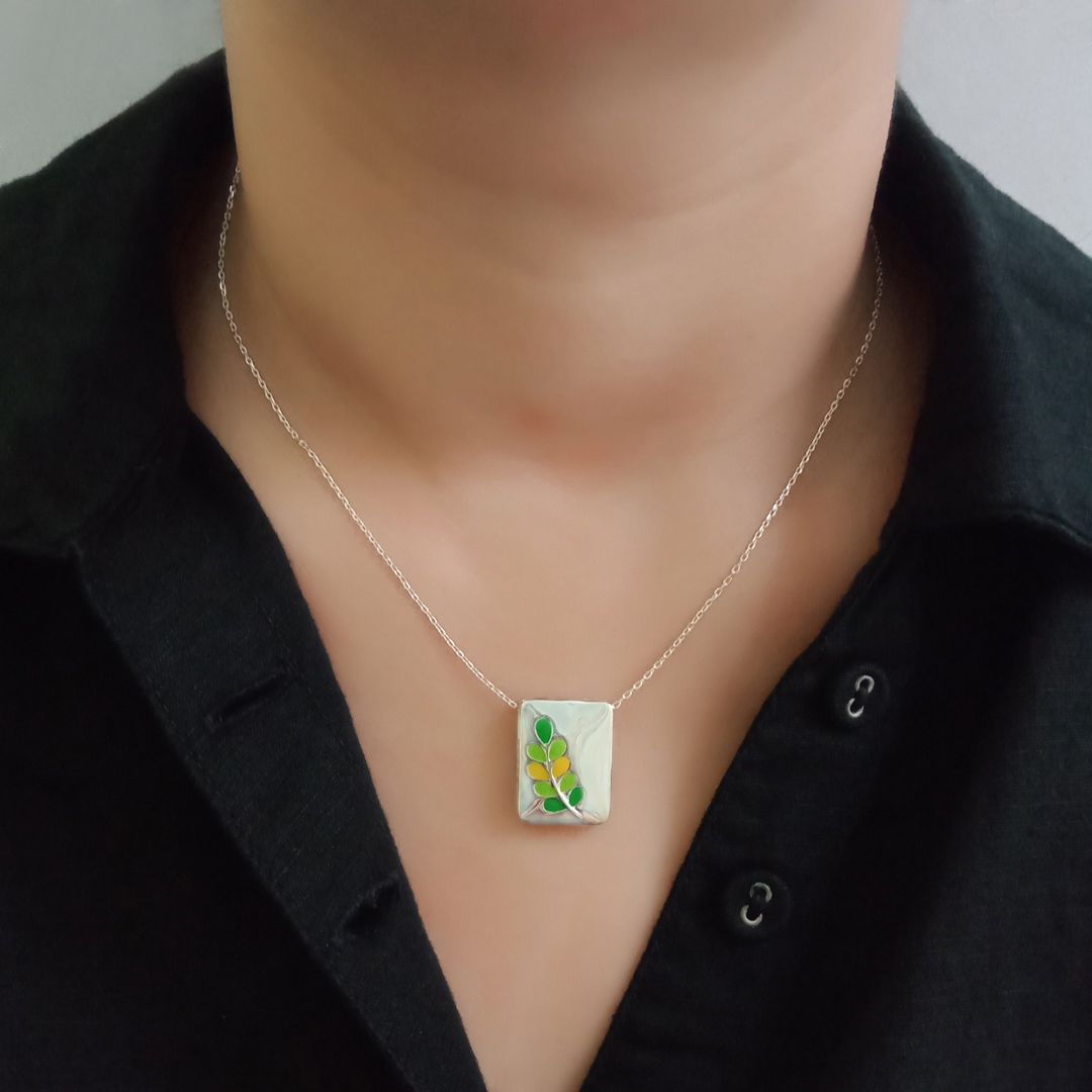 Crafted in 925 sterling silver, this pendant offers a timeless appeal and exceptional durability. The enamel work adds a splash of color, enhancing the leaf’s natural beauty and making it a standout accessory for any outfit.