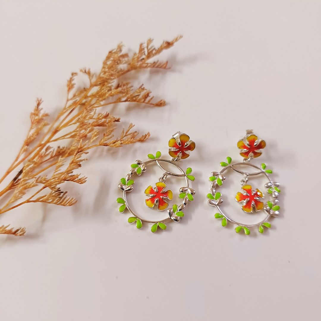 Style Tips : Embrace the Charm of Gulmohar with our 92.5 sterling silver jewellery collection Gulmohar, featuring vibrant enamel work in fiery reds and yellows. The lively colors and intricate designs are sure to uplift your mood. The designs are versatile, they complements both Indian and Western outfits and are perfect for any occasion. They are suitable for simple daytime elegance or layered glamour at night. Moreover they are a thoughtful gift for your loved ones.