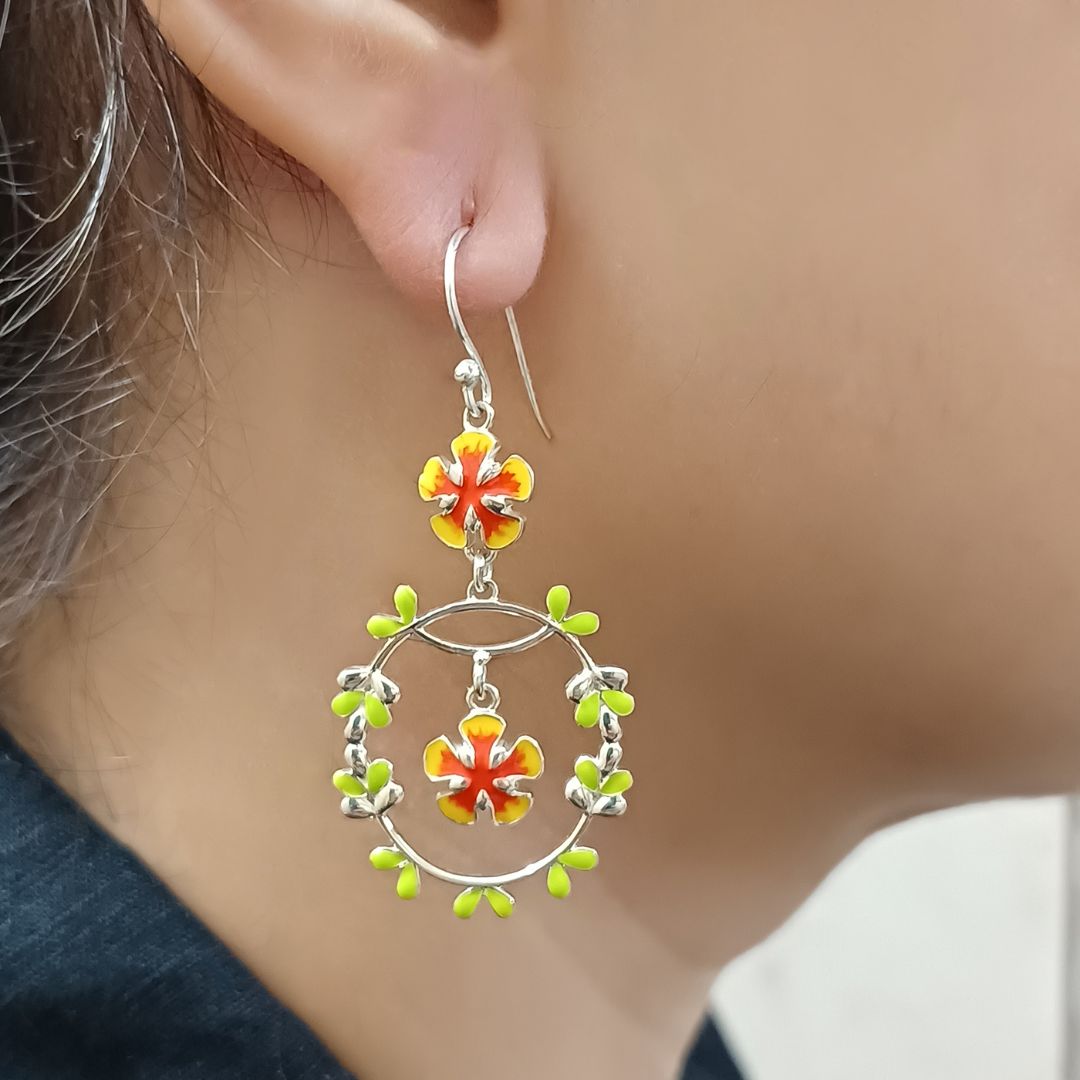 The design features intricately enameled gulmohar flowers with a sleek dangling oval frame, capturing the delicate essence of these vibrant blossoms. Each dangle gently sways with your movement, adding a touch of sophistication and grace to your look.