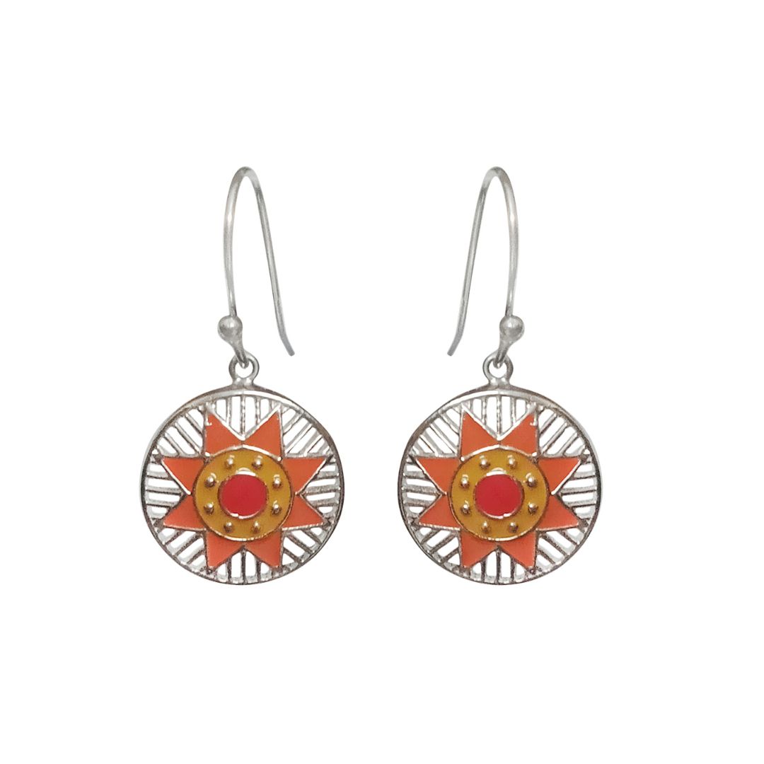 Introducing our exquisite 92.5 Sterling Silver Earrings, a radiant tribute to the Sun’s eternal brilliance. These stunning earrings are meticulously crafted to capture the vibrant essence of the sun’s rays, featuring an enchanting blend of orange, yellow, and red enamel hues. Each piece is a testament to exceptional craftsmanship and artistic flair, designed to add a touch of celestial elegance to any ensemble.